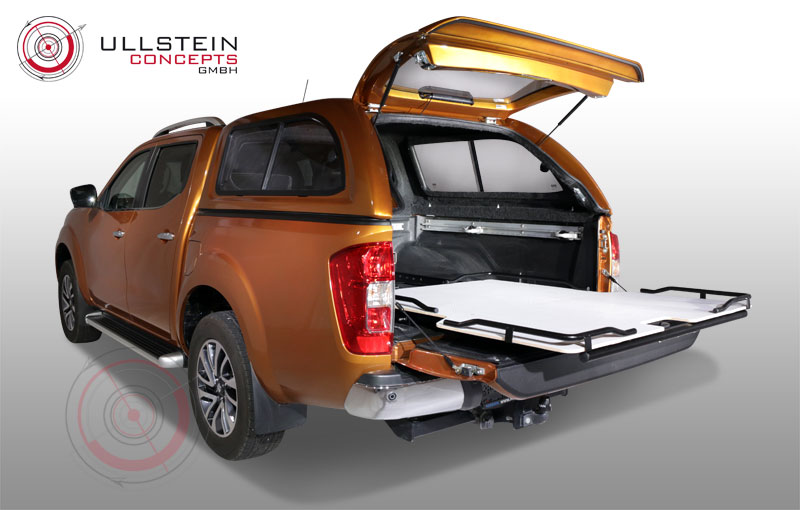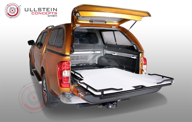 Mit unserer ausziehbaren Ladefläche beladen und verzurren Sie Ihre Ladung ganz einfach in Ihrem Pickup. Auch individuelle und fest montierte Schrankeinbauten sind dadurch auf Ihrer Ladefläche möglich. Da die Plattform in 5 verschiedenen Positionen eingerastet werden kann und sich insgesamt bis zu 1/2 ausziehen lässt, ist sie in jeglicher Situation bequem von drei Seiten zugänglich.