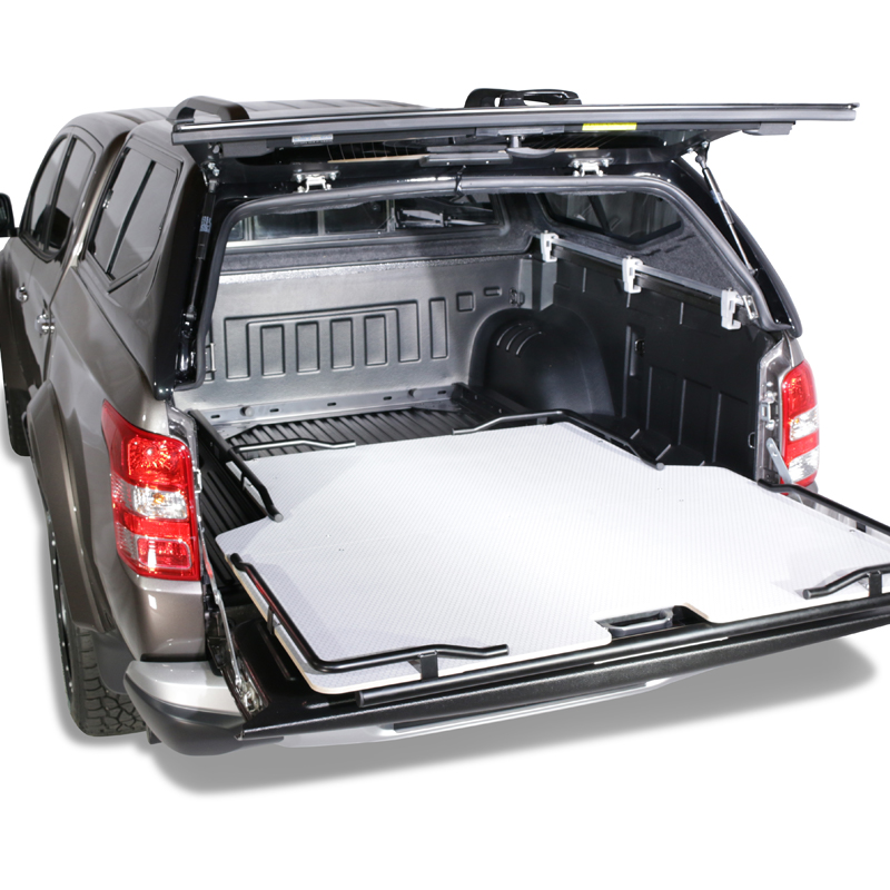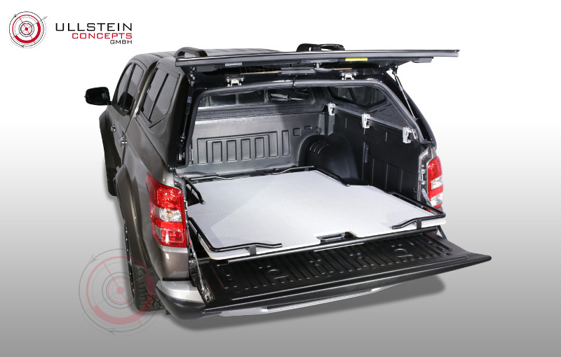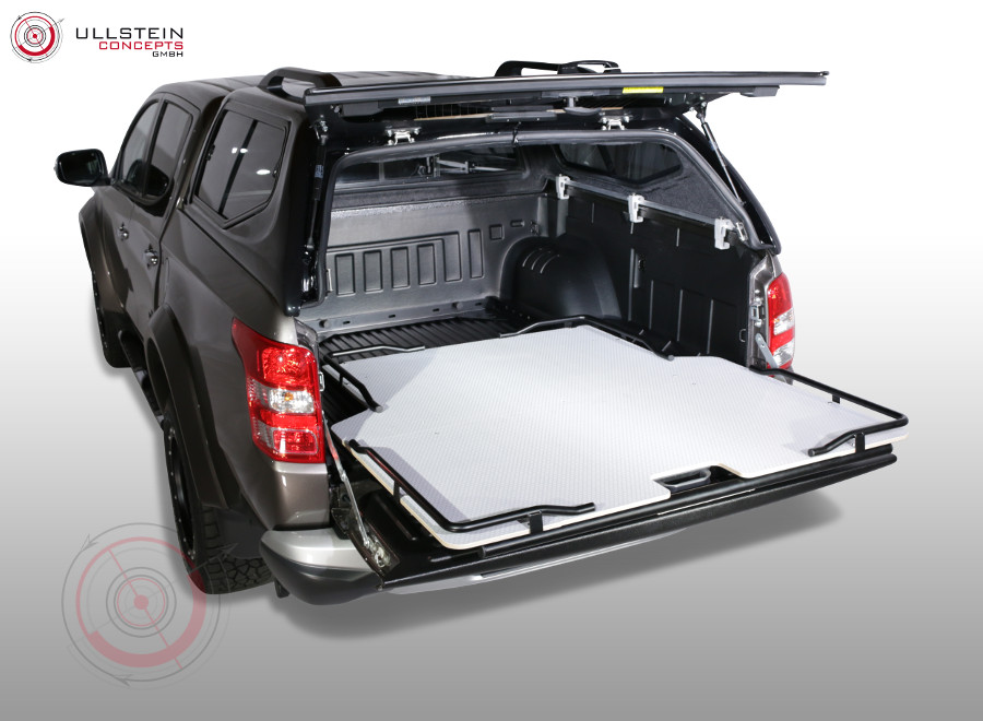 Mit unserer ausziehbaren Ladefläche beladen und verzurren Sie Ihre Ladung ganz einfach in Ihrem Pickup. Auch individuelle und fest montierte Schrankeinbauten sind dadurch auf Ihrer Ladefläche möglich. Da die Plattform in 5 verschiedenen Positionen eingerastet werden kann und sich insgesamt bis zu 2/3 ausziehen lässt, ist sie in jeglicher Situation bequem von drei Seiten zugänglich.