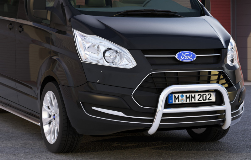 Frontschutzbügel für den aktuellen Ford Transit Custom und Tourneo Custom (auch für Modell "Sport"). Hergestellt aus 60 mm und 42 mm Edelstahlrohr hochglanzpoliert. Durch eine aufwendige Handpolitur unserer Edelstahlteile inkl. der Schweißnähte wird ein optimaler Korrosionsschutz gewährleistet. Unsere Frontbügel absolvierten die aktuellsten europäischen Prüfnormen und werden mit einem eingraviertem E-Prüfzeichen ausgeliefert. Eine zusätzliche TÜV Vorführung ist somit nicht mehr notwendig. Die computergesteuerte Produktentwicklung gewährleistet eine optimale Passform und ein harmonisches Design. Montagezeit cirka 30 bis 60 Minuten.