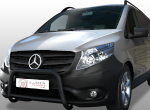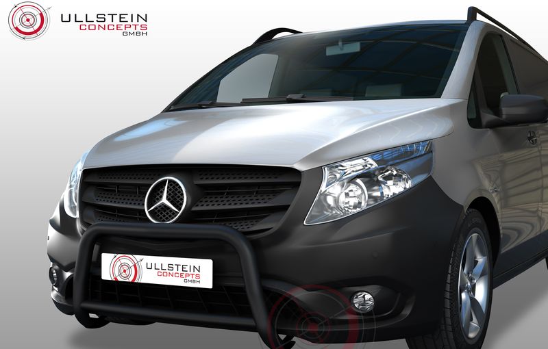 Frontschutzbügel aus Edelstahl 60 mm mit Querrohr 42 mm - schwarz pulverbeschichtet mit optimalem Korrosionsschutz. Unsere Frontbügel absolvierten die aktuellsten europäischen Prüfnormen und werden mit einem eingraviertem E-Prüfzeichen ausgeliefert. Eine zusätzliche TÜV Vorführung ist somit nicht mehr notwendig. Die computergesteuerte Produktentwicklung gewährleisten eine optimale Passform und ein harmonisches Design. Die Montagezeit beträgt ca. 30-60 Minuten. Für Mercedes Vito ab Bj. 10/2014.