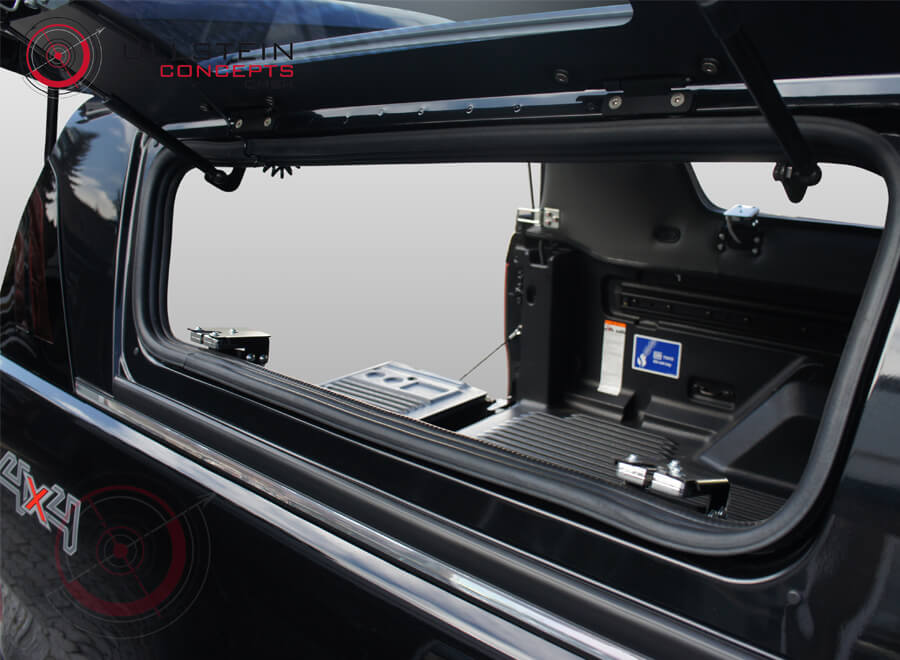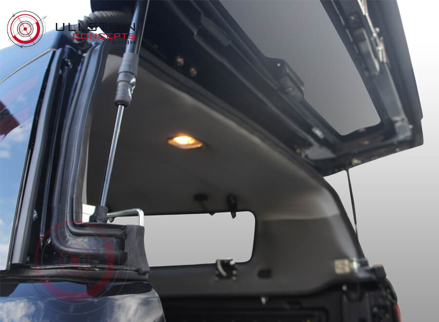Dieses TL1 Hardtop ist zusätzlich mit elektrischen Glasklappen ausgestattet. Die Heck- sowie Seitenklappen werden dabei mit der Zentralverriegelung des Fahrzeugs verbunden. Die Seitenklappen haben eine elektrische Entriegelung, welche über einen Druckknopf an der Rückseite der Hardtop-Bugwand ausgelöst wird. Somit öffnet sich die jeweilige Glasklappe mit einem Knopfdruck! Die elektrische Entriegelung der Seitenklappen ist ausschließlich bei entsperrtem Fahrzeug aktiviert.