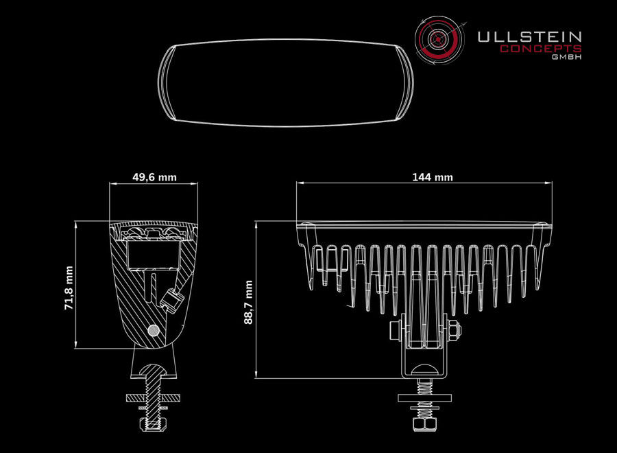Um die Montage zu vereinfachen, wird der E-Line R Rückfahrscheinwerfer mit einem DT-2-Anschluss geliefert. Mit einer Länge von 14,4 cm und einer Höhe von nur 5 cm (ohne Halterung) ergeben sich viele mögliche Montagepositionen.