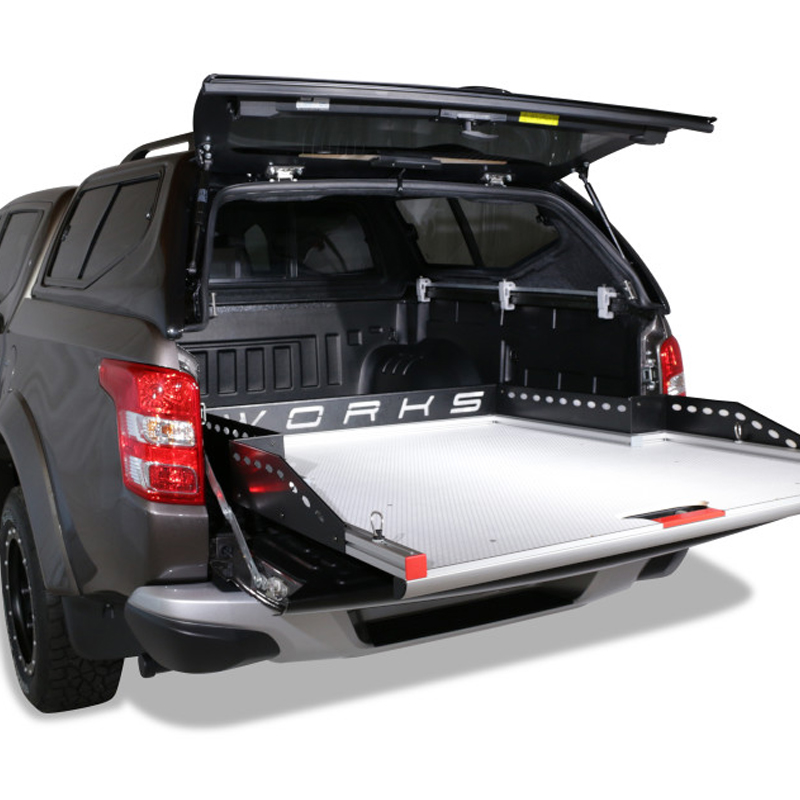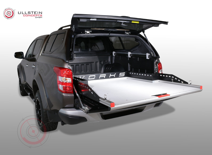 Mit unserem neuen ausziehbaren Schiebeplateau WORKS beladen und sichern Sie Ihr Ladegut professionell in Ihrem Pickup. Das neue Schubladensystem eröffnet aufgrund seiner Aluminiumbauart viele neue Möglichkeiten für einen individuellen Ausbau sowie eine spezifische Nutzung des Pickup-Laderaums. Ein großer Vorteil unseres Produkts besteht in dessen Form: aufgrund der Verjüngung des Ladeflächenauszugs zwischen den Radkästen, ist der Laderaum perfekt ausgenutzt und vorne im Bereich der Heckklappe entsteht noch mehr Platz in der Breite für Ihr Ladegut.
