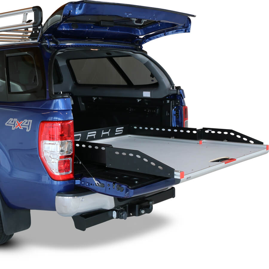 Mit unserem neuen ausziehbaren Schiebeplateau WORKS beladen und sichern Sie Ihr Ladegut professionell in Ihrem Pickup. Das neue Schubladensystem eröffnet aufgrund seiner Aluminiumbauart viele neue Möglichkeiten für einen individuellen Ausbau sowie eine spezifische Nutzung des Pickup-Laderaums. Ein großer Vorteil unseres Produkts besteht in dessen Form: aufgrund der Verjüngung des Ladeflächenauszugs zwischen den Radkästen, ist der Laderaum perfekt ausgenutzt und vorne im Bereich der Heckklappe entsteht noch mehr Platz in der Breite für Ihr Ladegut.