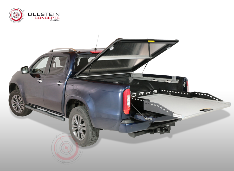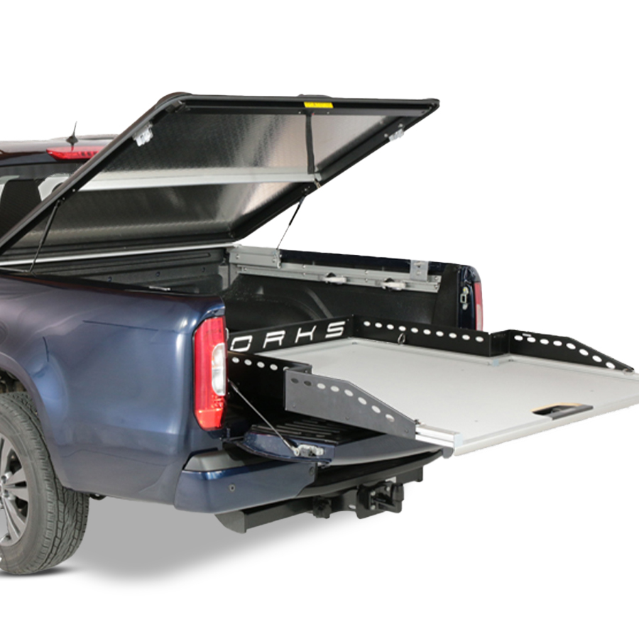 Mit unserem neuen ausziehbaren Schiebeplateau WORKS beladen und sichern Sie Ihr Ladegut professionell in Ihrem Pickup. Das neue Schubladensystem eröffnet aufgrund seiner Aluminiumbauart viele neue Möglichkeiten für einen individuellen Ausbau sowie eine spezifische Nutzung des Pickup-Laderaums. Ein großer Vorteil unseres Produkts besteht in dessen Form: aufgrund der Verjüngung des Ladeflächenauszugs zwischen den Radkästen, ist der Laderaum perfekt ausgenutzt und vorne im Bereich der Heckklappe entsteht noch mehr Platz in der Breite für Ihr Ladegut.