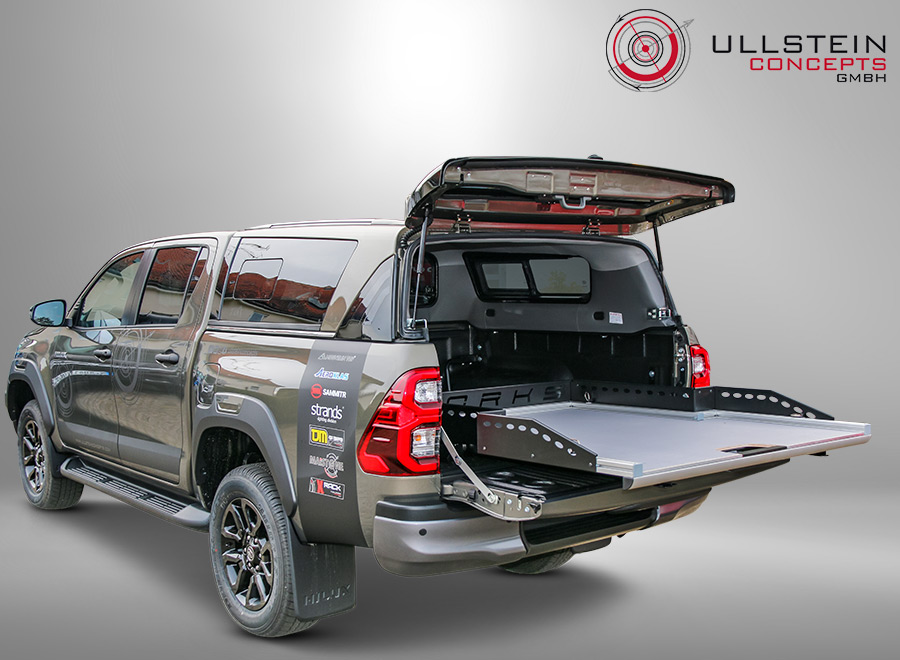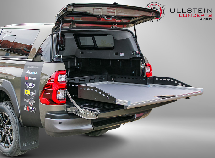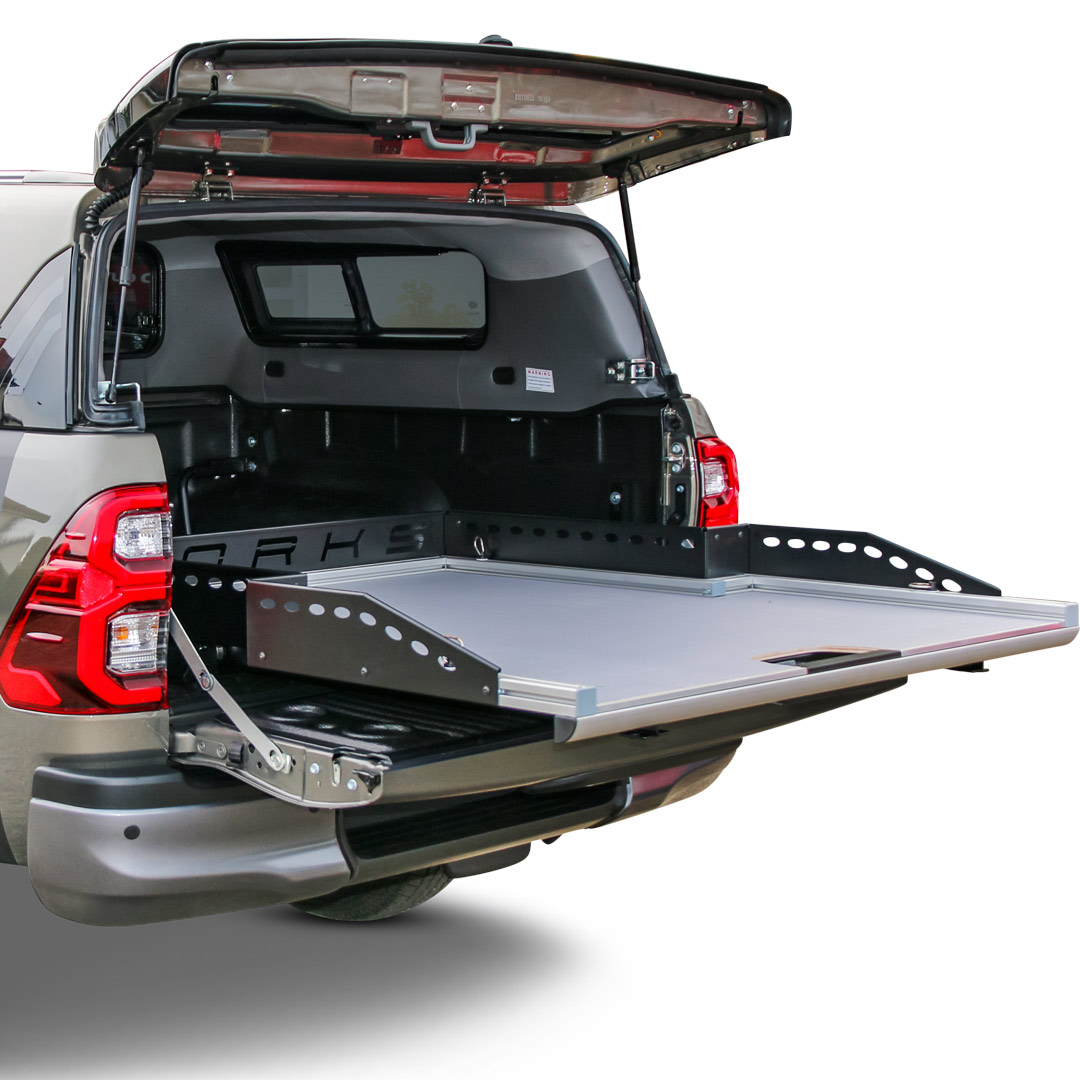 Mit unserem neuen ausziehbaren Schiebeplateau WORKS beladen und sichern Sie Ihr Ladegut professionell in Ihrem Pickup. Das neue Schubladensystem eröffnet aufgrund seiner Aluminiumbauart viele neue Möglichkeiten für einen individuellen Ausbau sowie eine spezifische Nutzung des Pickup-Laderaums. Ein großer Vorteil unseres Produkts besteht in dessen Form: aufgrund der Verjüngung des Ladeflächenauszugs zwischen den Radkästen, ist der Laderaum perfekt ausgenutzt und vorne im Bereich der Heckklappe entsteht noch mehr Platz in der Breite für Ihr Ladegut.