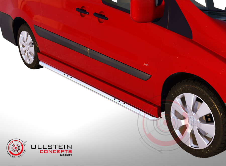 Schwellerrohre aus spiegelpoliertem Edelstahl mit Auftrittnoppen aus oval geformten Edelstahl 90x45 mm. Enthält ein Schwellerrohr für die linke und ein Schwellerohr für die rechte Fahrzeugseite. Durch eine aufwendige Handpolitur unserer Edelstahlteile wird ein optimaler Korrosionsschutz gewährleistet. Unsere Flankenschutzrohre sind TÜV geprüft und werden mit TÜV Gutachten geliefert. Die computergesteuerte Produktentwicklung gewährleistet eine optimale Passform und ein harmonisches Design. Einfache Montage in ca. 30-60 Minuten. Für den Citroen Jumpy ab 2012.