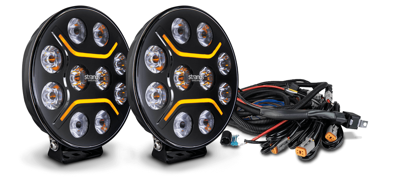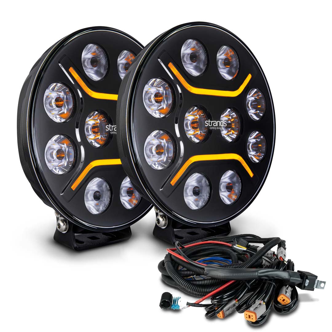 Ein Paar Strands Dark Knight Intense 9" Zusatzscheinwerfer mit passendem Kabelsatz
