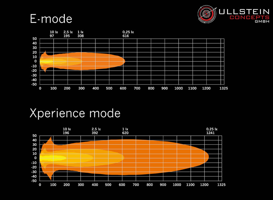 Leuchtweite bei 1lux (m): E-Mode 308 lm - Xperience: 620 lm