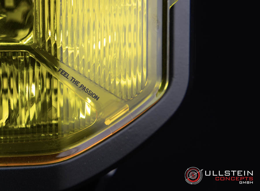 Das Positionslicht leuchtet durch das Logo auf der Rückseite des Gehäuses hindurch und sorgt so für einen auffälligen Effekt aus jedem Blickwinkel. Eine schwarze Schutzabdeckung und ein gelbes Flutlicht-Cover sind im Lieferumfang enthalten.