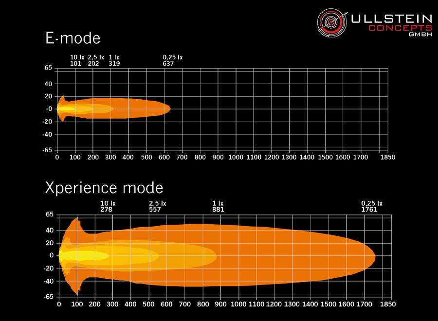 Leuchtweite bei 1lux (m): E-mode 319 lm Xperience: 881 lm