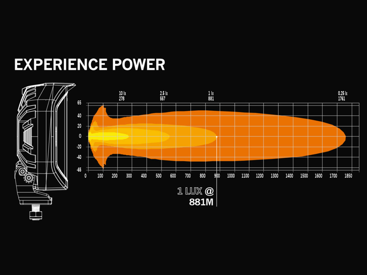 Der ungedrosselte Xperience-Modus mit 13.350 gemessenen Lumen holt das Maximum an verfügbarer Lichtleistung aus dem Zusatzscheinwerfer, und generiert dabei eine Sichtweite von beeindruckenden 881m.