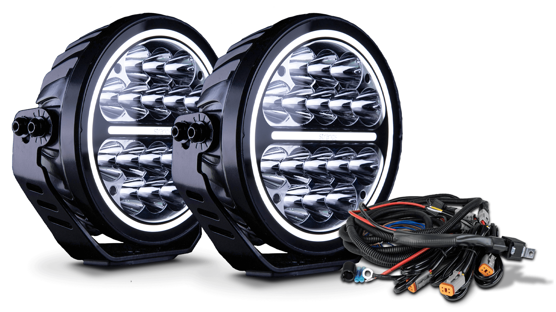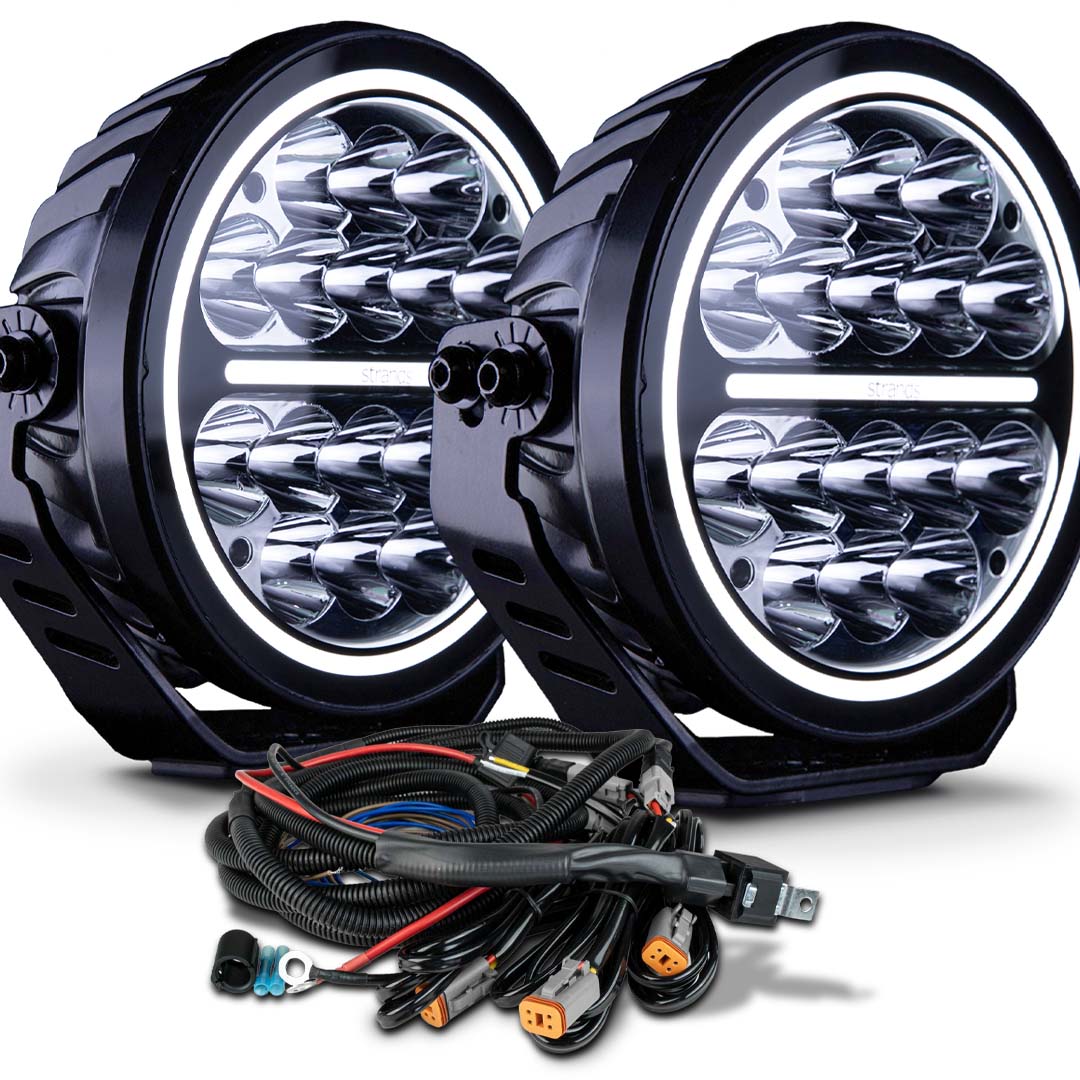 Ein Paar Strands Siberia XP 7" Fernscheinwerfer mit passendem Kabelkit