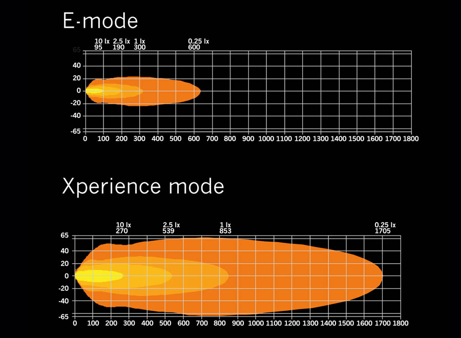 Leuchtweite bei 1lux (m) E-mode: 300 Xperience: 853