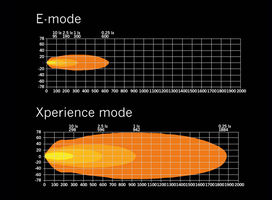 Der ungedrosselte Xperience-Modus holt mit 19.150 aktiven Lumen das Maximum an verfügbarer Lichtleistung aus dem Zusatzscheinwerfer, und generiert dabei eine beeindruckende Sichtweite von 942 Meter.