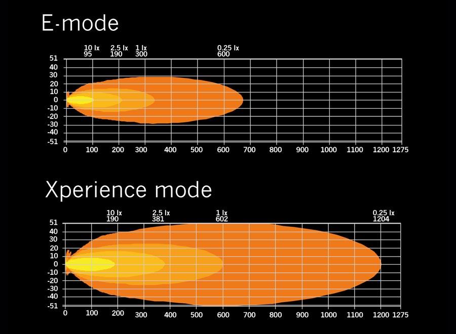 Der ungedrosselte Xperience-Modus holt mit 7.150 aktiven Lumen das Maximum an verfügbarer Lichtleistung aus dem Zusatzscheinwerfer, und generiert dabei eine beeindruckende Sichtweite von 602m.