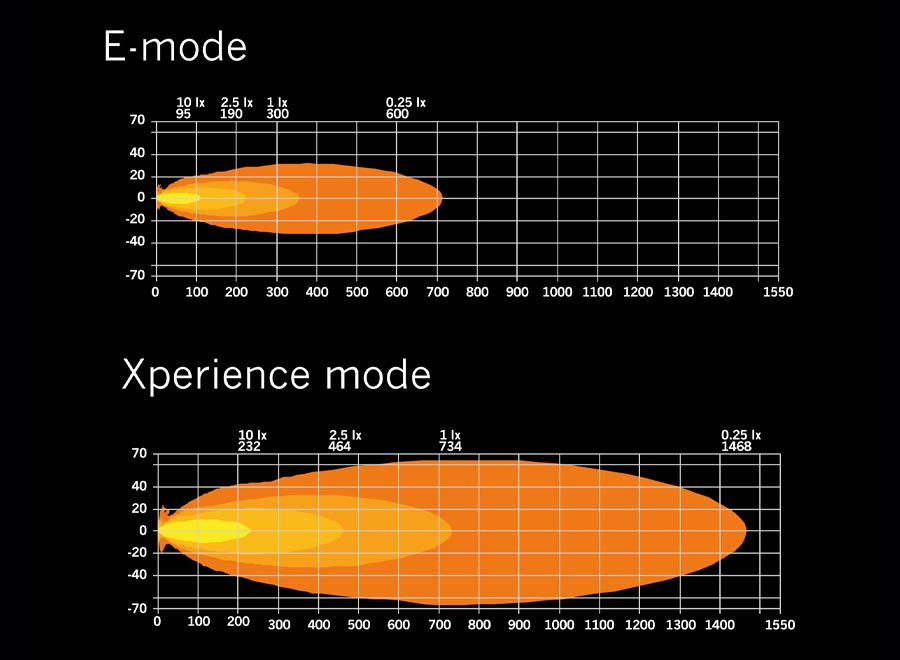 Leuchtweite bei 1lux (m) E-mode: 300 Xperience: 734