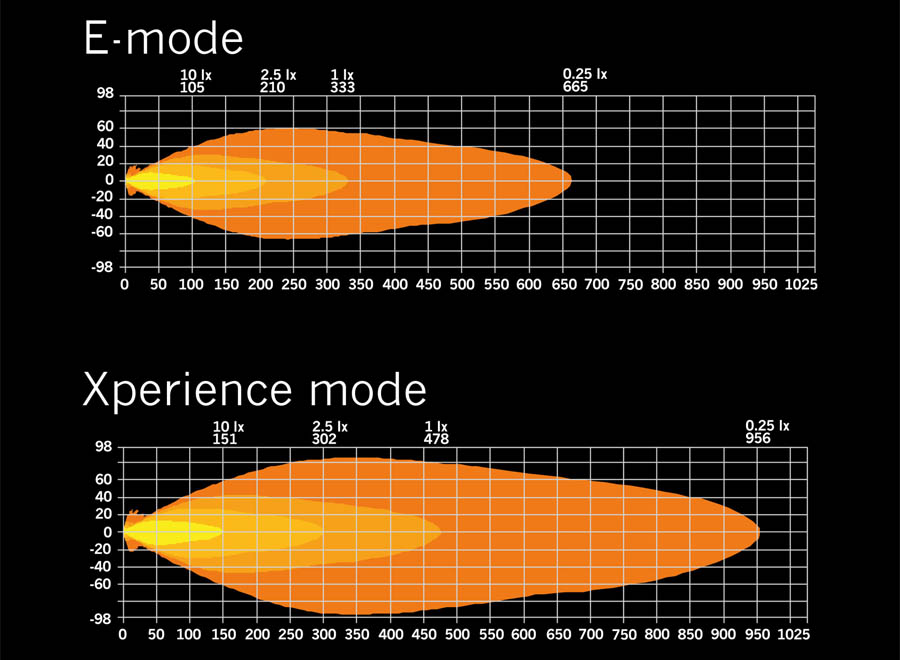 Leuchtweite bei 1lux (m): E-mode: 333 Xperience: 467
