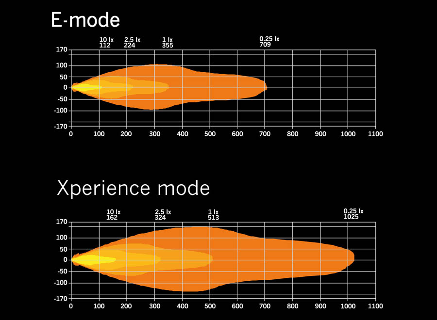 Leuchtweite bei 1lux (m): E-mode: 355 Xperience: 513