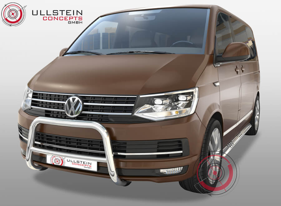 Frontschutzbügel aus spiegelpoliertem Edelstahl. Durch eine aufwendige Handpolitur unserer Edelstahlteile inkl. der Schweißnähte wird ein optimaler Korrosionsschutz gewährleistet. Unsere Frontbügel absolvierten die aktuellsten europäischen Prüfnormen und werden mit einem eingraviertem E-Prüfzeichen ausgeliefert. Eine zusätzliche TÜV Vorführung ist somit nicht mehr notwendig. Die computergesteuerte Produktentwicklung gewährleisten eine optimale Passform und ein harmonisches Design. Die Montagezeit beträgt ca. 30-60 Minuten. Für den Volkswagen T6 Modell.