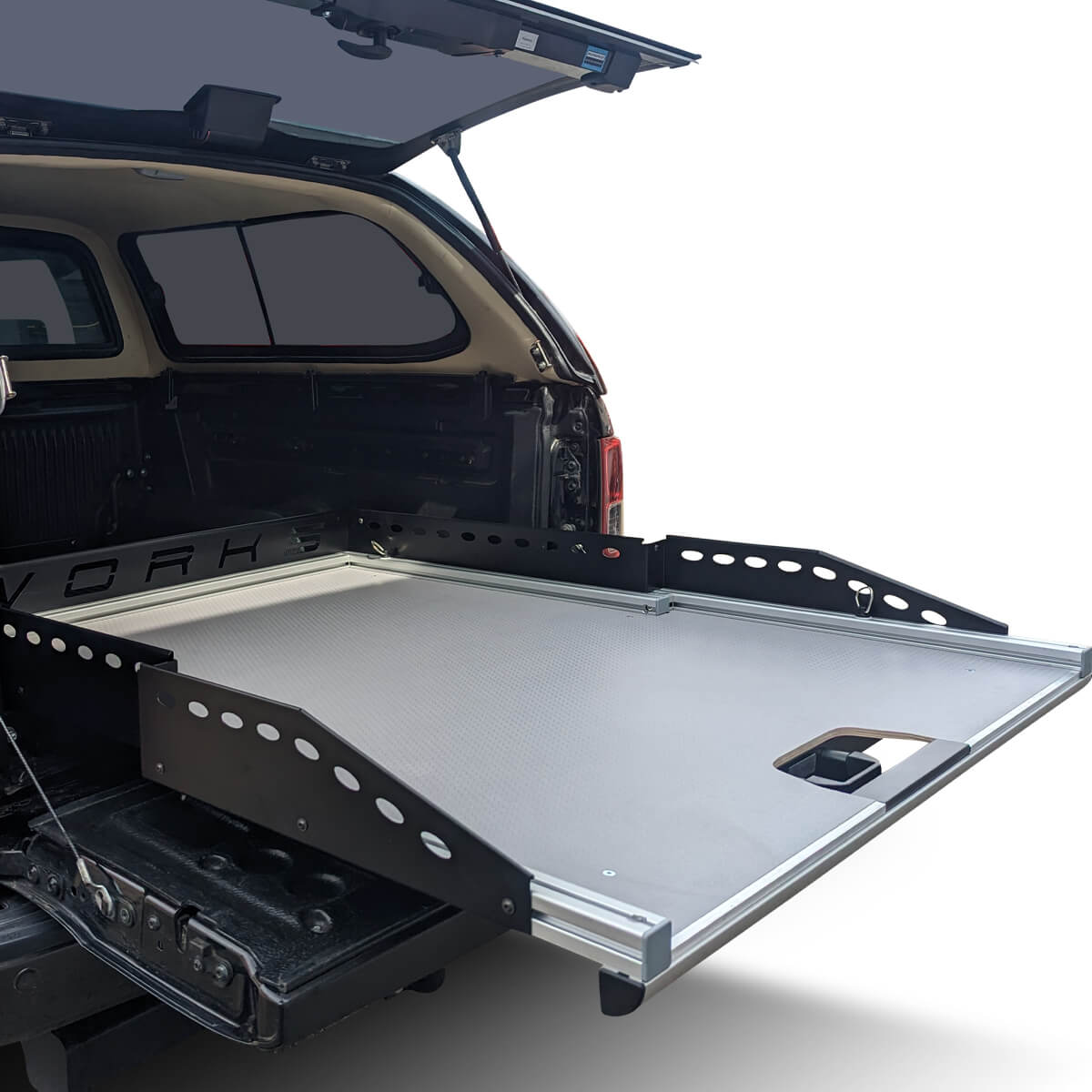 Mit unserem neuen ausziehbaren Schiebeplateau WORKS beladen und sichern Sie Ihr Ladegut professionell in Ihrem Pickup. Das neue Schubladensystem eröffnet aufgrund seiner Aluminiumbauart viele neue Möglichkeiten für einen individuellen Ausbau sowie eine spezifische Nutzung des Pickup-Laderaums.