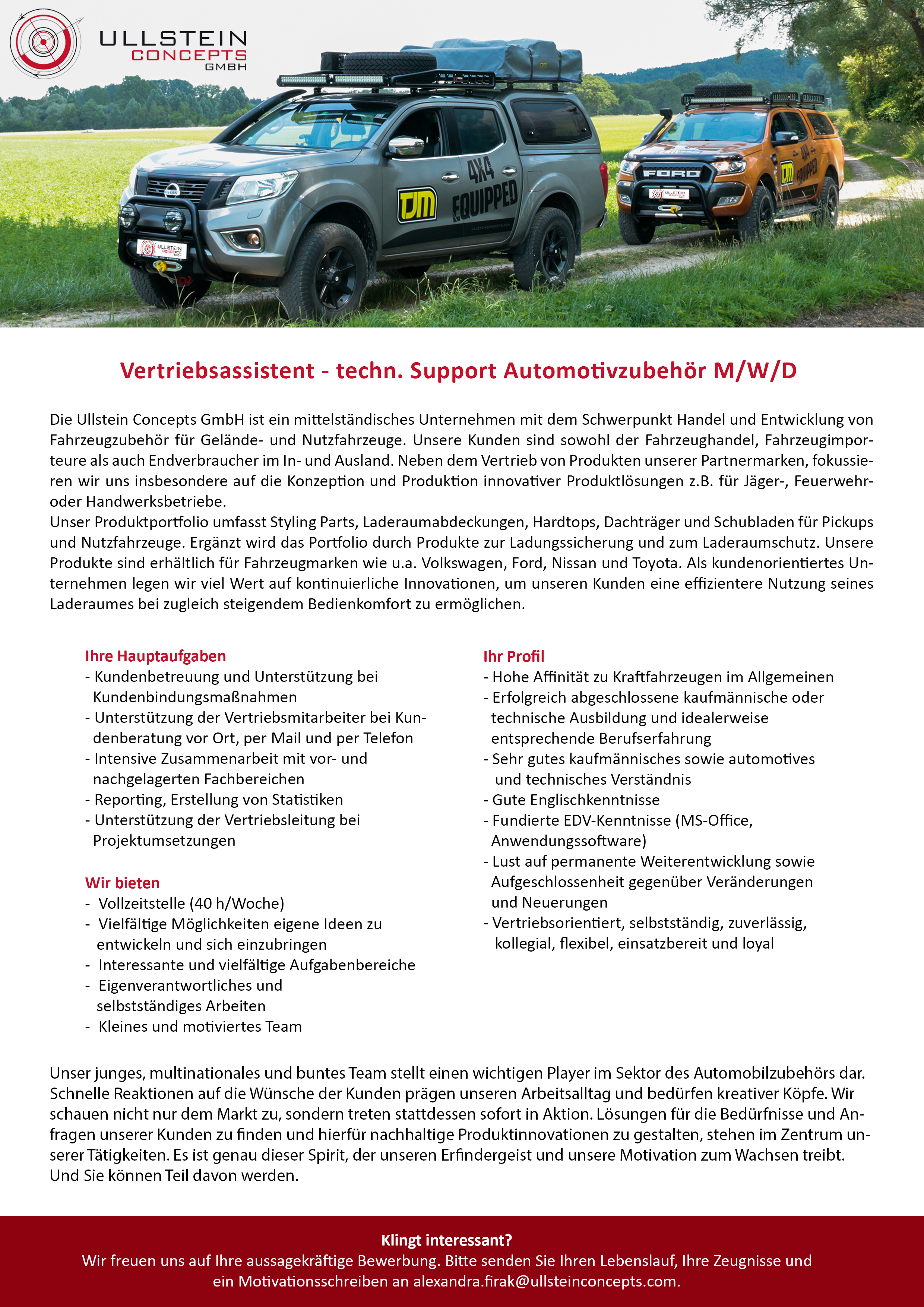 Die ULLSTEIN CONCEPTS GMBH ist ein bekanntes und geschätztes mittelständisches Unter nehmen im Raum Freising, das sich auf den Handel, die Entwicklung und Einbau von Fahrzeug zubehör im Gelände- und Nutzfahrzeugbereich spezialisiert hat. Die Schwerpunkte unserer Ge schäftstätigkeit liegen im Verkauf von Fahrzeugzubehör im Gelände- und Nutzfahrzeugbereich. Erweitert werden diese noch durch unser Dienstleistungsangebot, insbesondre Werkzeuge von Milwaukee und Works Schubladen, sowie Service- und Montagearbeitgen. Unsere Kunden sind sowohl der Fahrzeughandel, Fahrzeugimporteure als auch der Endverbraucher im In- und Aus land