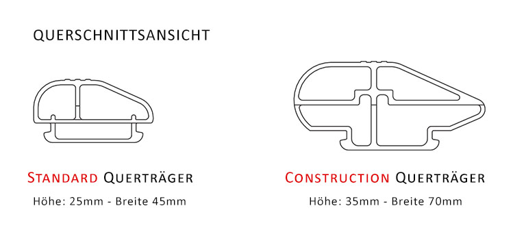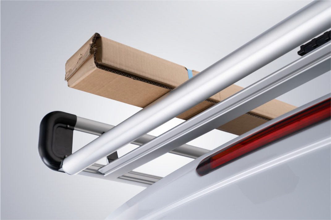 Die Aluminium-Querträger werden mit Strangpressprofilen aus eigener Herstellung gefertigt. Die Oberseite ist gummiert, um ein Verrutschen der Ladung zu verhindern. Die ABS-Endkappen sorgen für einen eleganten und professionellen Look.