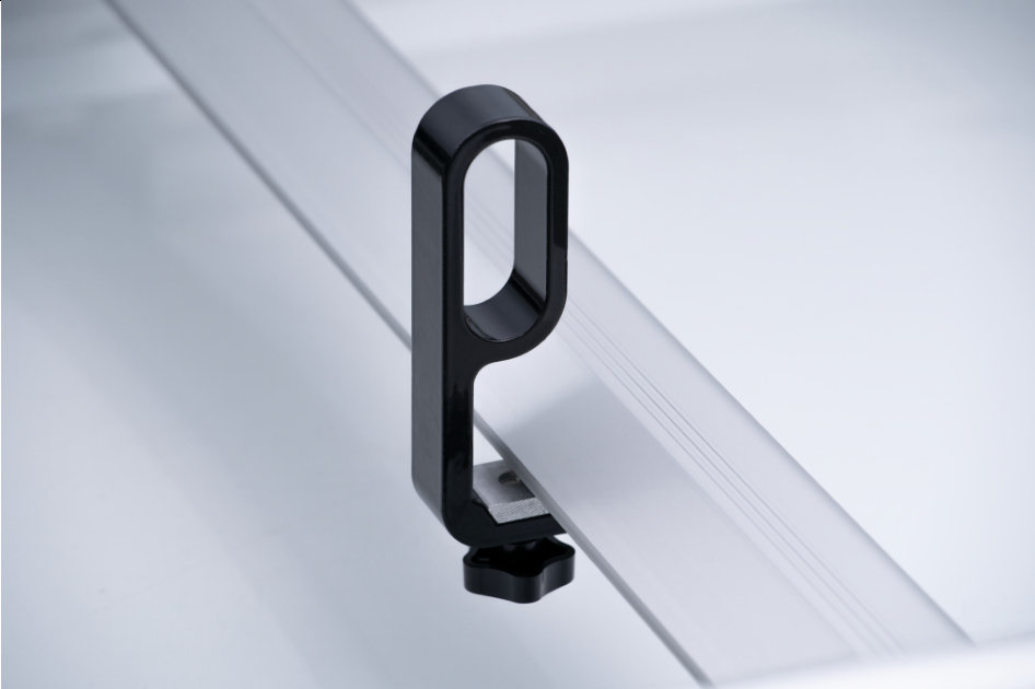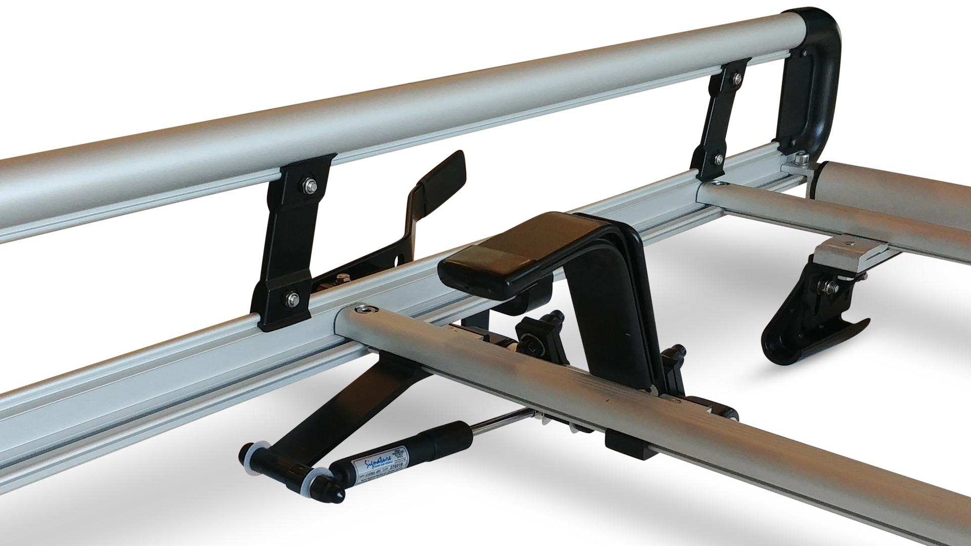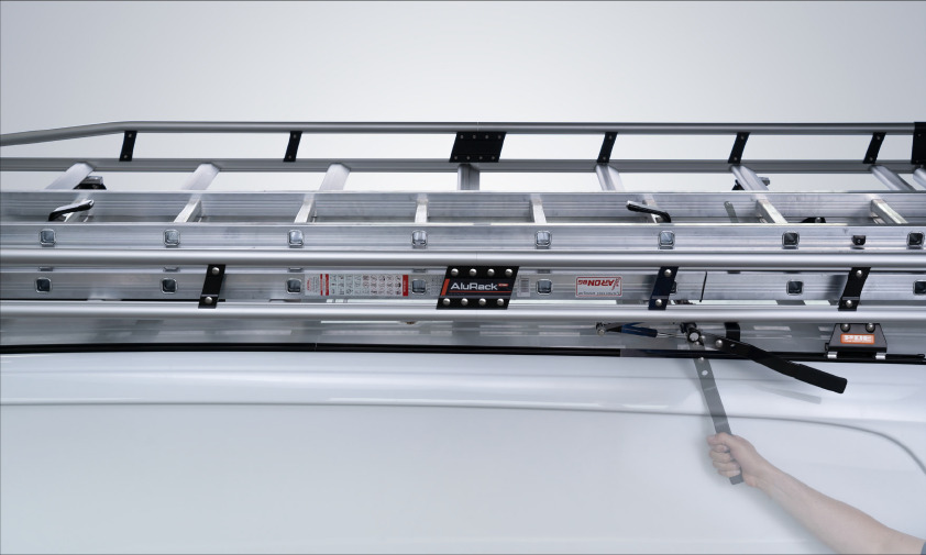 Die S-Clamp ermöglicht den einfachen und effizienten Transport leichter Stufen- und Ausziehleitern auf Fahrzeugen mit niedrigem Dach. Sie sichert die Leiter mit einem gasfederunterstützten Haken. Der vordere Haken hilft die Leiter auf dem Dachträger zu positionieren. Durch