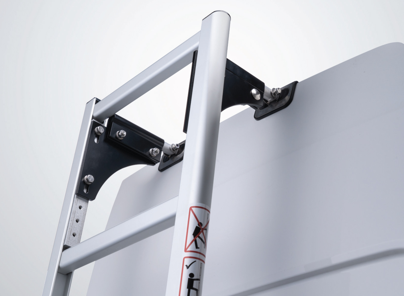 Aufgrund der Aluminiumbauweise ist die Heckleiter sehr leicht und kann von einer Person montiert werden. Wenn Sie einen Fuhrpark oder mehrere Fahrzeuge desselben Modells haben, kann die Heckleiter schnell von einem Fahrzeug auf ein anderes gewechselt werden.