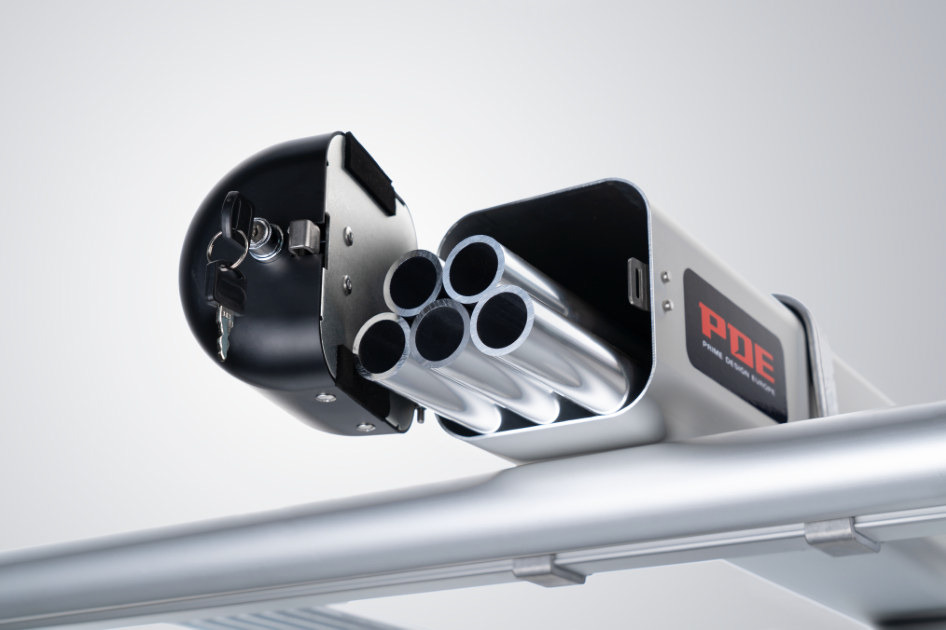 TransportrohrBeidseitig abschließbares Laderohr (2–5 m lang, 125 mm Querschnitt). Die Montage erfolgt mit einem Bügel auf den Querträgern, sodass der Innenraum vollständig genutzt werden kann