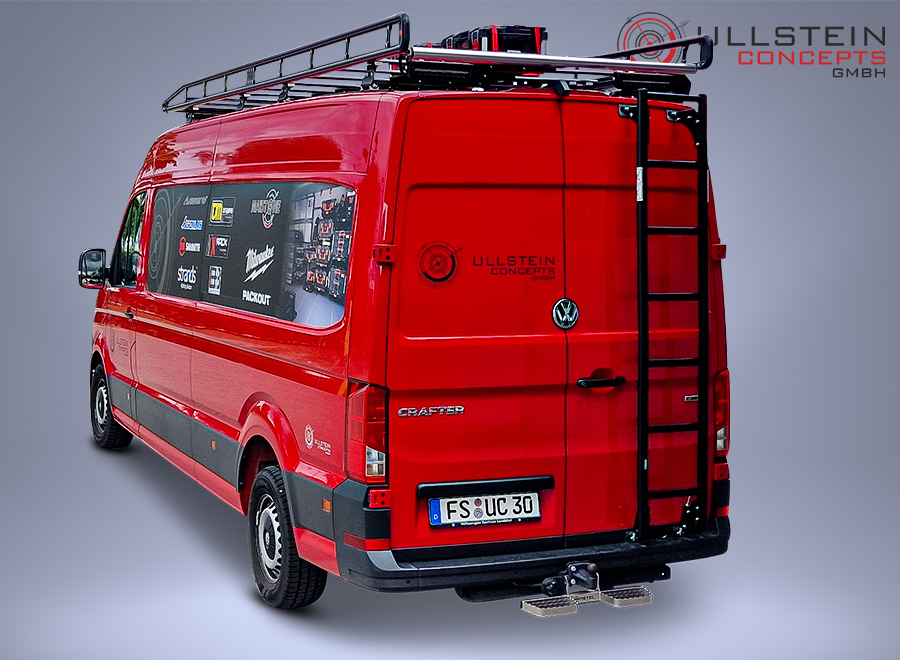 Con il geniale ancoraggio a incastro la foratura del portellone posteriore è superflua e il montaggio è estremamente facile. La scaletta può essere rimossa in qualsiasi momento. Avvisi sull'impiego: La scaletta è stata sviluppata esclusivamente per veicoli con porte a due ante.
