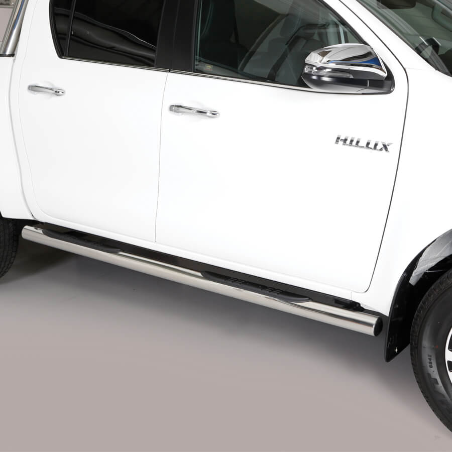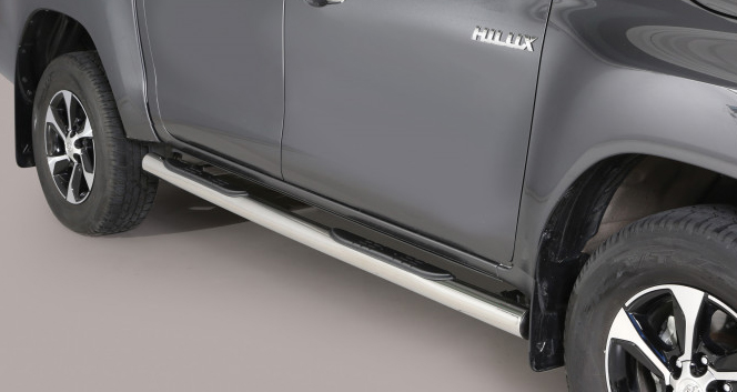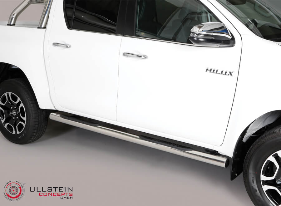 Tubi di protezione sottoporta in acciaio inossidabile di alta qualità. Include un tubo per il lato sinistro e uno per il lato destro. I tubi delle sottoporta sono testati dal TÜV e approvati per l'uso su strada in conformità con l'attuale legislazione UE. Lo sviluppo computerizzato del prodotto garantisce un adattamento ottimale, che assicura la compatibilità con il veicolo, nonché un design armonioso. Per Toyota Hilux Cabina Doppia da 2021.