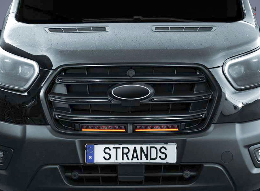 Il kit di montaggio dei LED è stampato in 3D direttamente presso Strands in Svezia da plastica di alta qualità per adattarsi perfettamente alla Ford Transit. Per l'installazione, la griglia del radiatore deve essere tagliata secondo le istruzioni di installazione e nella maggior parte dei casi non sarà necessario rimuovere la griglia del radiatore del veicolo per l'installazione.