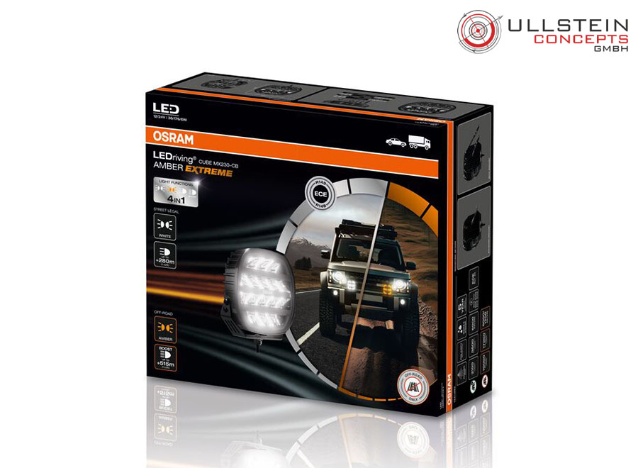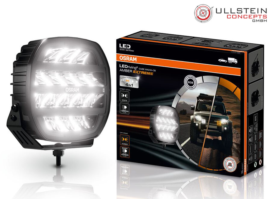 Il proiettore abbagliante supplementare OSRAM LEDriving® Cube MX230-CB AMBER EXTREME ridefinisce le prestazioni e il design in una potente soluzione di illuminazione. Grazie allo schema del fascio combo per l'illuminazione a corto e lungo raggio, offre un'impressionante portata luminosa fino a 515 m in modalità boost. Con una resa luminosa fino a 10.000 lumen effettivi, garantisce la massima visibilità anche negli ambienti più difficili. La sua innovativa configurazione 4-in-1 combina abbaglianti, luci di posizione arancioni e bianche e una funzione boost, offrendo la massima flessibilità in tutte le condizioni atmosferiche e di luce. La distintiva luce di posizione arancione è più di una semplice funzione: è una dichiarazione di design forte per i conducenti che apprezzano sia le prestazioni che l'estetica.