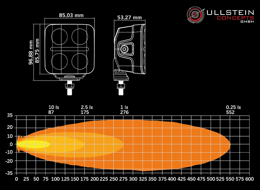 Con un angolo di emissione di 21,0°, il mini proiettore raggiunge una portata di 240 m con 2710 lumen. Perfetta per illuminare a giorno un'area a grande distanza.