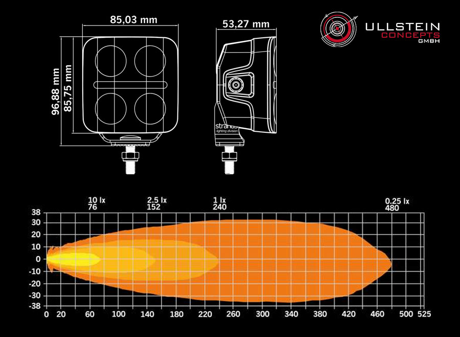 Con un angolo di emissione di 21,0°, il mini proiettore raggiunge una portata di 240 m con 2710 lumen. Perfetta per illuminare a giorno un'area a grande distanza.