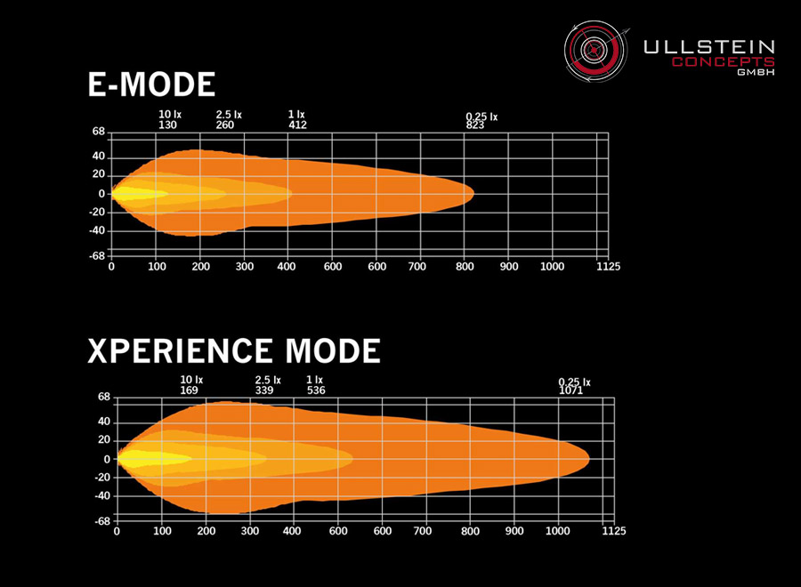 Nella modalità Xperience, l'Outlaw UDX 12” raggiunge un'enorme illuminazione di 8.000 lumen misurati. La modalità omologata E fornisce un abbagliante ottimizzato per le condizioni stradali con 4370 lumen misurati.