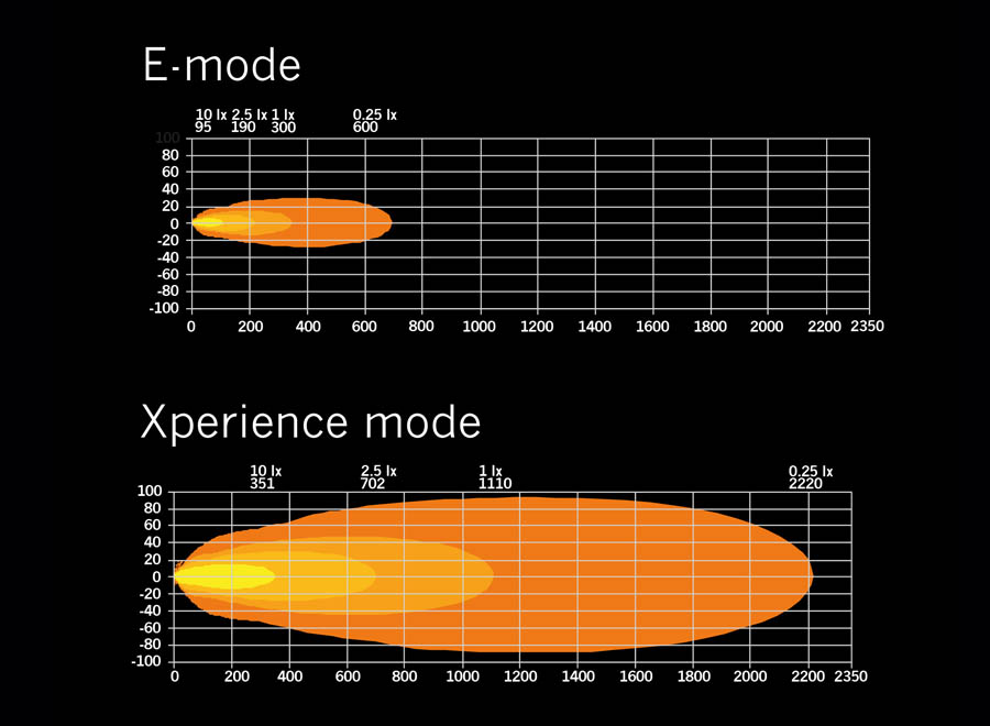 Con 25.500 lumen attivi, la modalità Xperience non strozzata ottiene la massima potenza luminosa disponibile dal proiettore supplementare, generando un impressionante raggio di visibilità di 1110 metri.
