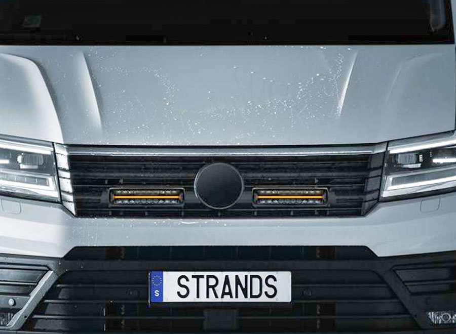 Il kit di montaggio dei LED è stampato in 3D direttamente presso Strands in Svezia da plastica di alta qualità per adattarsi perfettamente alla VW Crafter. Per l'installazione, la griglia del radiatore deve essere tagliata secondo le istruzioni di installazione e nella maggior parte dei casi non sarà necessario rimuovere la griglia del radiatore del veicolo per l'installazione.
