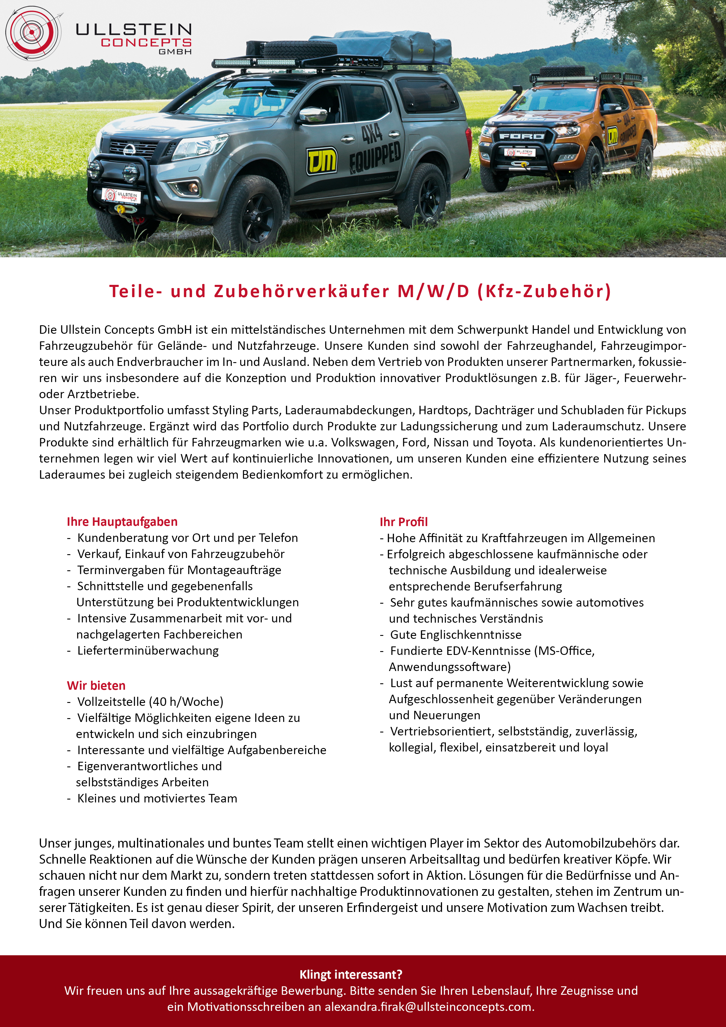 Die ULLSTEIN CONCEPTS GMBH ist ein bekanntes und geschätztes mittelständisches Unter nehmen im Raum Freising, das sich auf den Handel, die Entwicklung und Einbau von Fahrzeug zubehör im Gelände- und Nutzfahrzeugbereich spezialisiert hat. Die Schwerpunkte unserer Ge schäftstätigkeit liegen im Verkauf von Fahrzeugzubehör im Gelände- und Nutzfahrzeugbereich. Erweitert werden diese noch durch unser Dienstleistungsangebot, insbesondre Werkzeuge von Milwaukee und Works Schubladen, sowie Service- und Montagearbeitgen. Unsere Kunden sind sowohl der Fahrzeughandel, Fahrzeugimporteure als auch der Endverbraucher im In- und Aus land