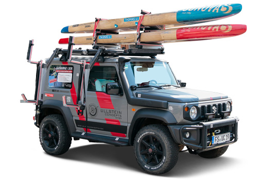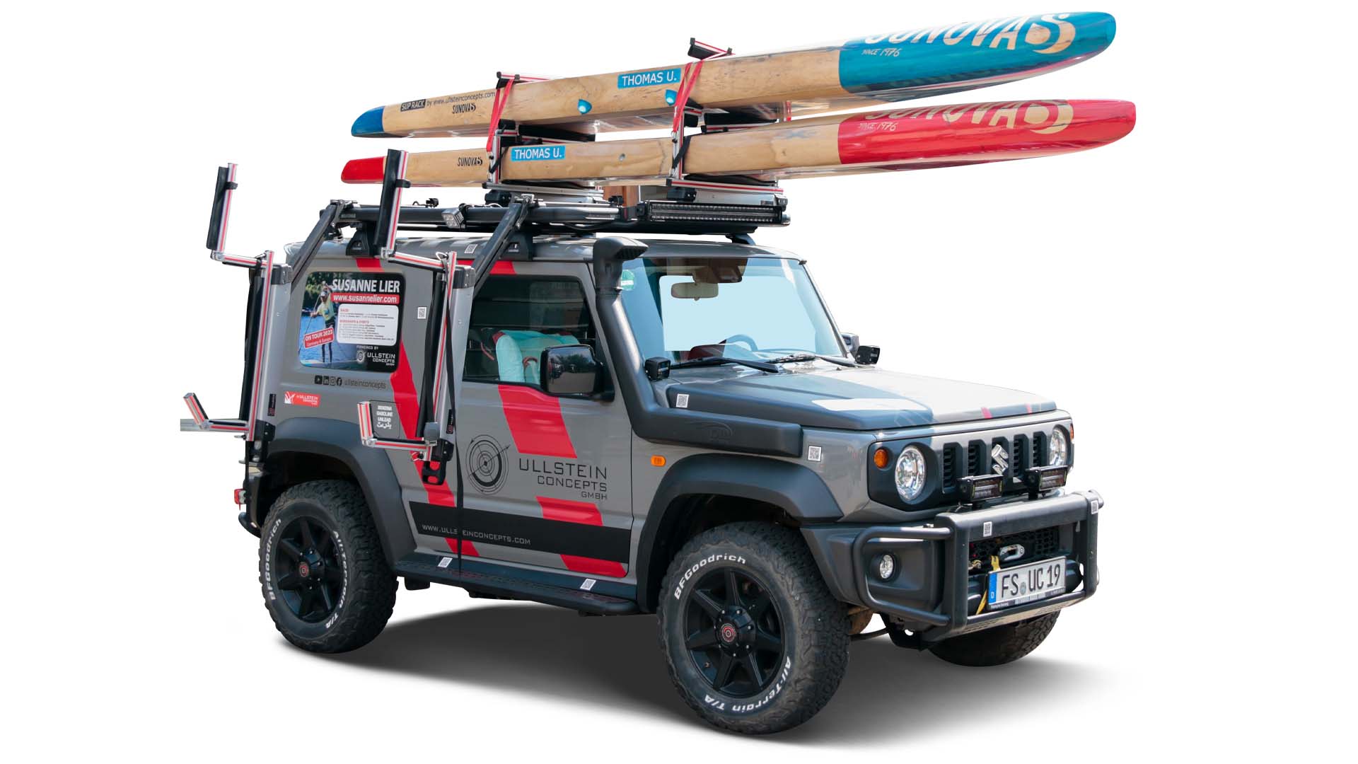 Der absenkbare SUP Dachträger eignet sich ideal für alle Fahrzeuge mit erhöhtem Dach wie SUVs, Pickups oder Transporter. Mit dem optionalem Zusatzmodul lassen sich bis zu 4 Hardboards auf dem Fahrzeugdach transportieren.
