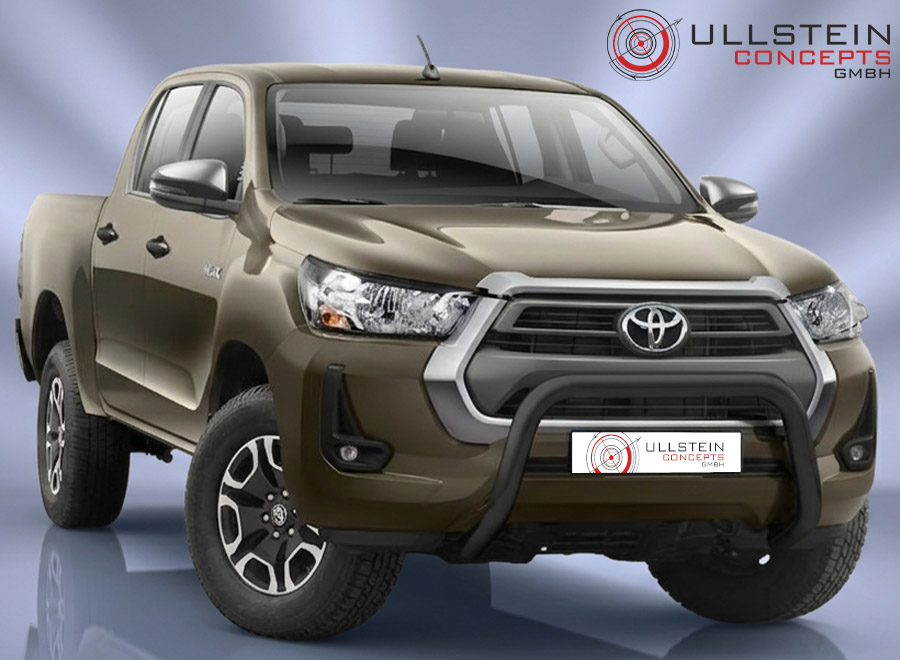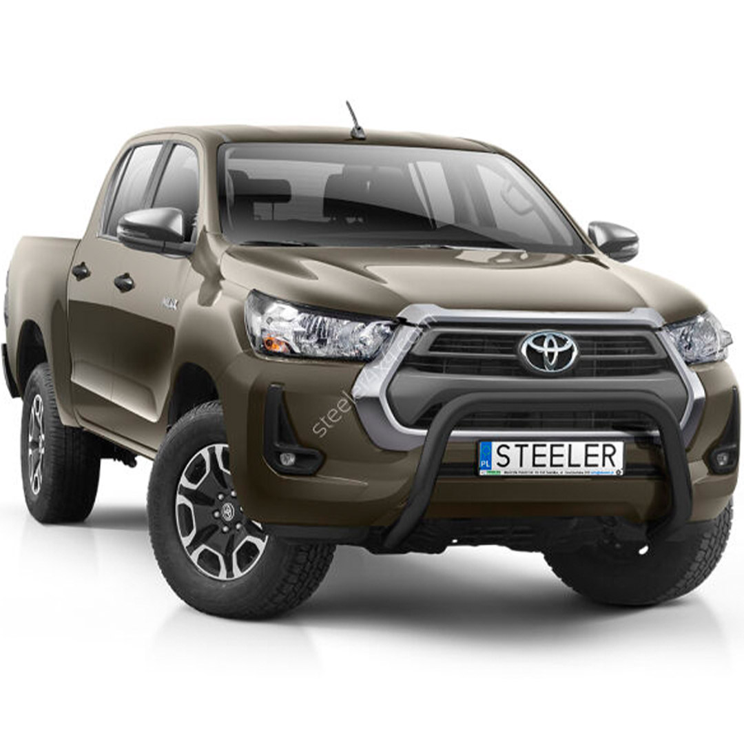 The wide front protection bar with cross reliably protects the bumper from mechanical damage and gives the Toyota Hilux a striking appearance.