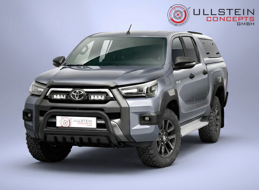 The wide front guard with plate reliably protects the bumper from mechanical damage and gives the Toyota Hilux Invincible a striking appearance.
