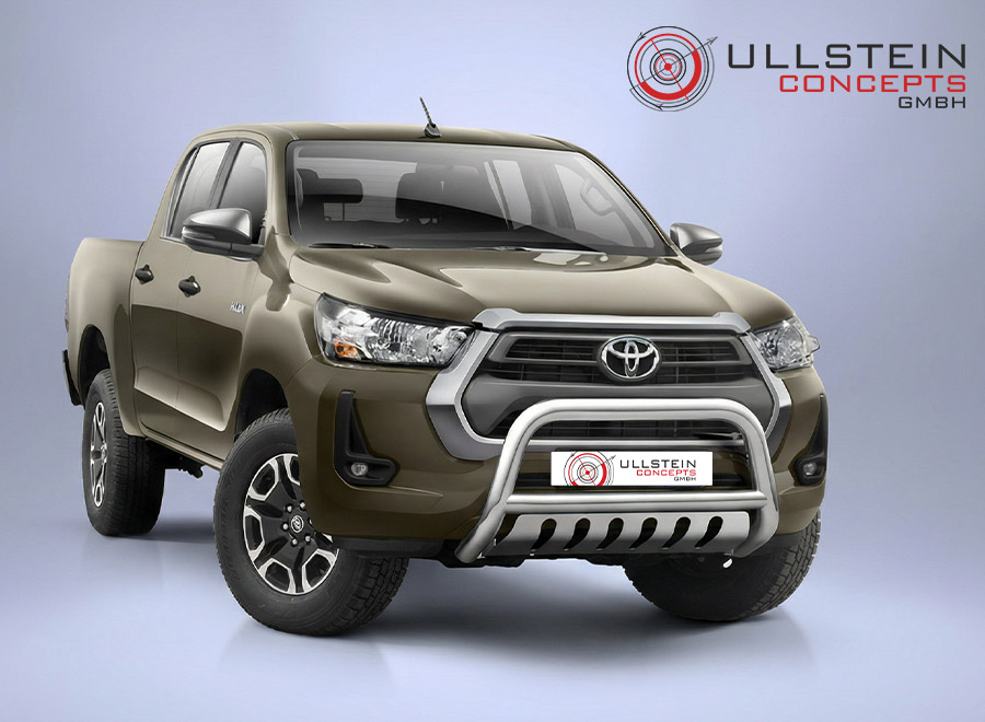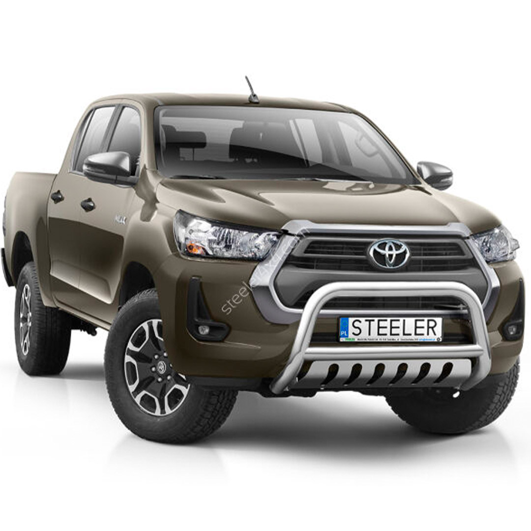 The wide front guard with sheet metal reliably protects the bumper from mechanical damage and gives the Toyota Hilux a striking appearance.