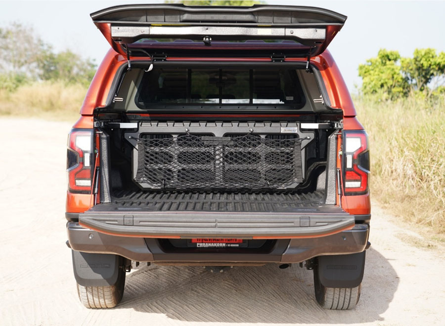 The bed divider system is mounted directly to the factory C-Channel rail system of the VW Amarok from year of manufacture 2023. The partition grille with a practical storage net can be moved variably and is infinitely adjustable by means of a locking knob.
