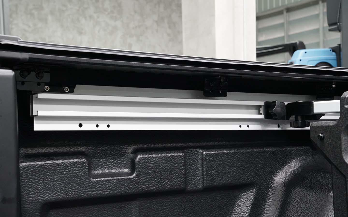 • Seamless Compatibility: The Amarok bed divider system is compatible with a variety of accessories such as an under-rail bed liner, hardtops, or tailgate dampers. When installing in combination with the factory electric roller shutter, it is necessary to shorten the side aluminum rails.