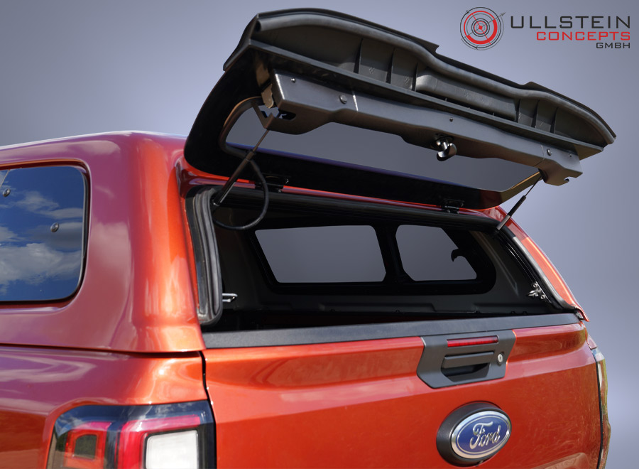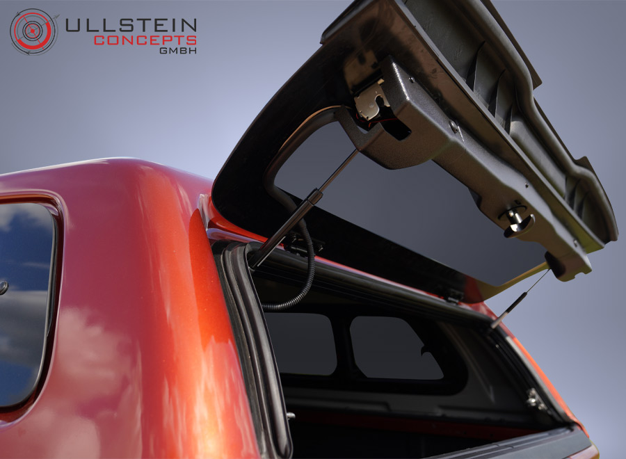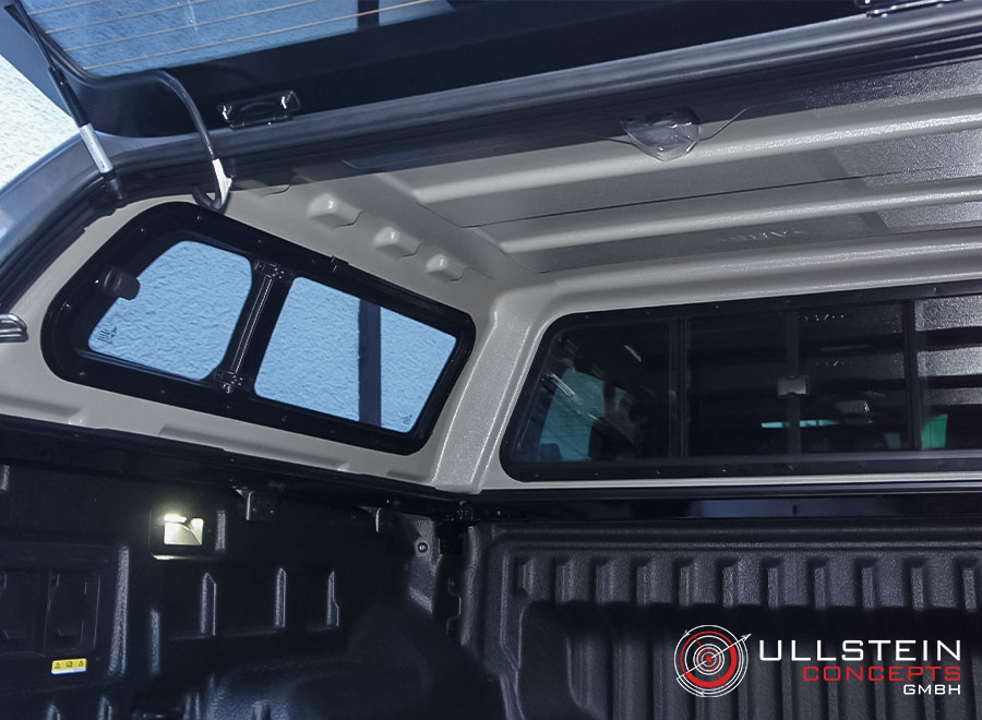 The side and rear windows are opened by means of pushbuttons and are equipped with gas struts and are integrated into the central locking system. The rear window with tinted, approx. 5 mm thick safety glass, offers the driver a clear view to the rear. In addition, the canopy comes with a drop-down front window that allows for cleaning of the vehicle's back window.
