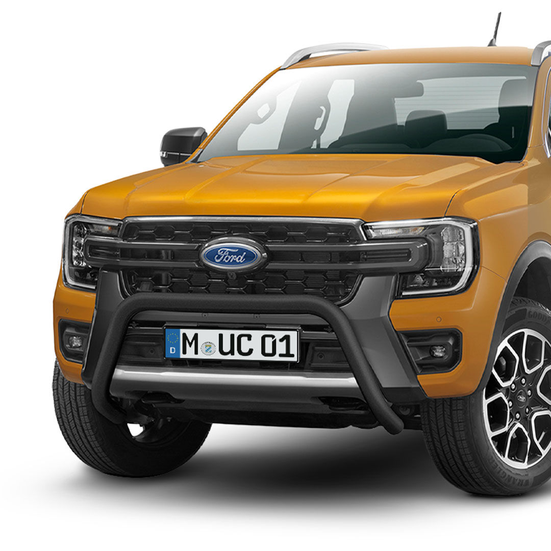 Front protection bar in black - Ford Ranger (2023 -) Hand-polished AISI-304 stainless steel with a sturdy 70 mm tube diameter.