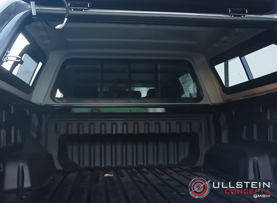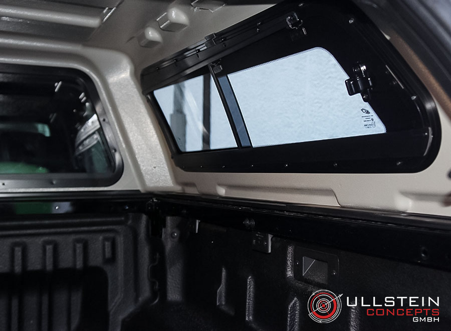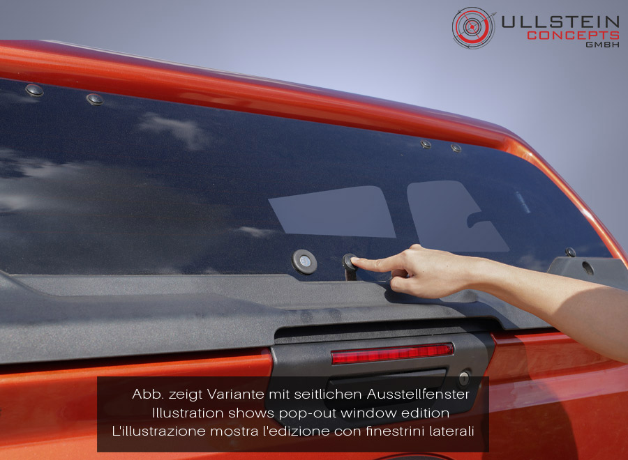 The side and rear windows are opened by means of pushbuttons and are equipped with gas struts and are integrated into the central locking system. The rear window with tinted, approx. 5 mm thick safety glass, offers the driver a clear view to the rear. In addition, the canopy comes with a third LED brake light and a drop-down front window that allows for cleaning of the vehicle's back window.