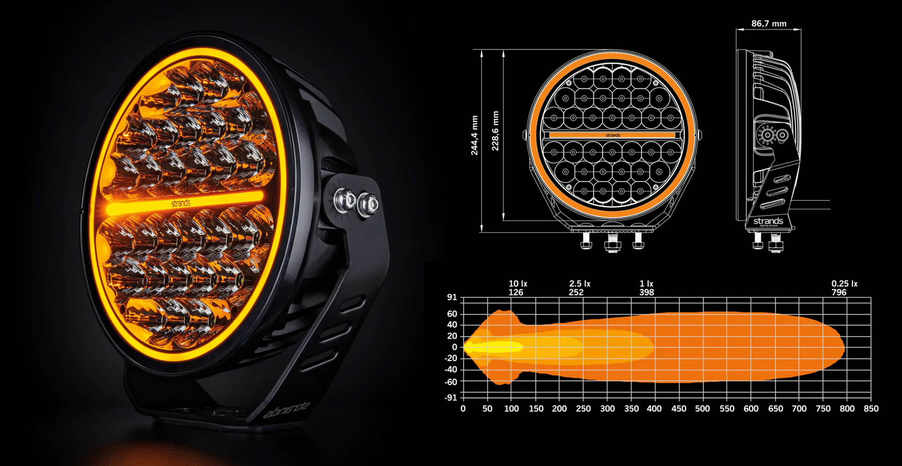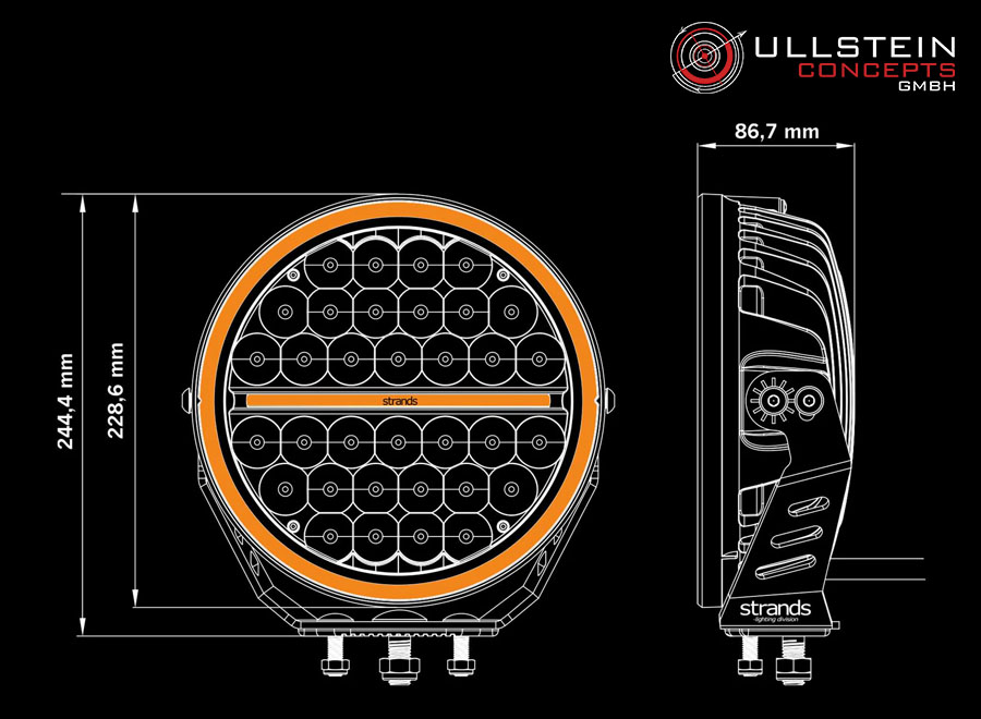 Strands - Siberia Night Ranger: Large 9 inch round offroad LED driving lights. Approved as driving lights according to ECE R112 and additionally as a position light according to ECE R7